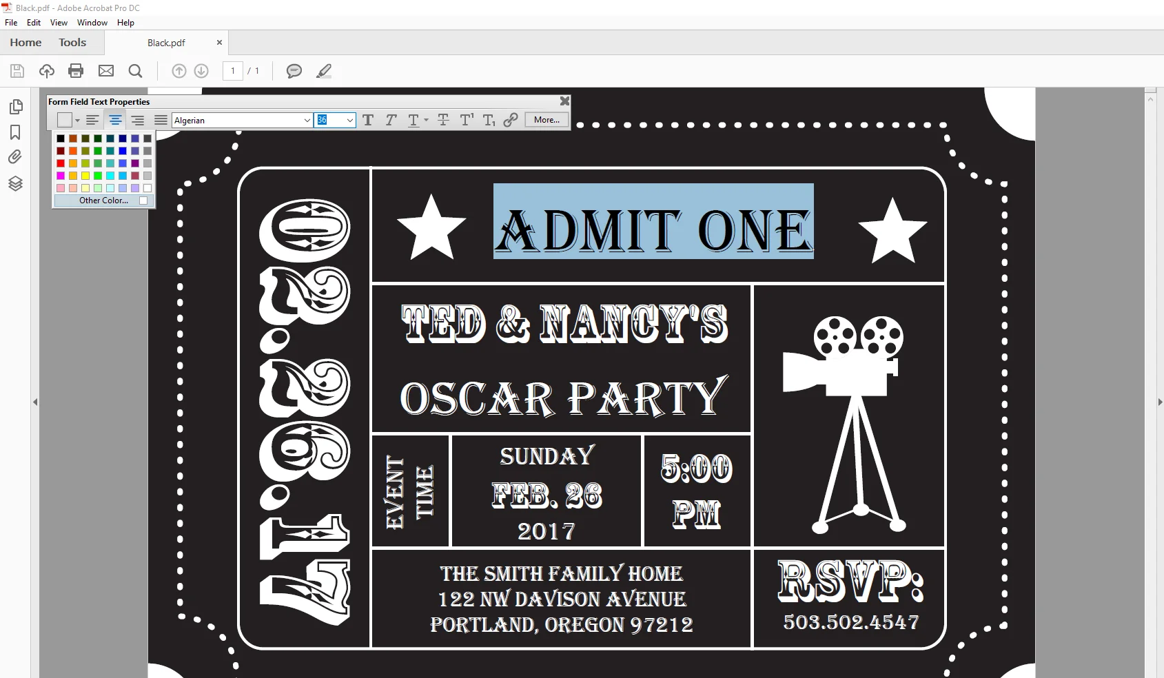 To edit the font color, highlight or select the sample text that you want to change, then press [Cmd-E] for Mac users or [Ctrl-E] for PC users to open properties bar, from here you can edit the font color. Simply select the color button on the left side and then either select one of the pre-existing colors or create your own custom color using the color dial.